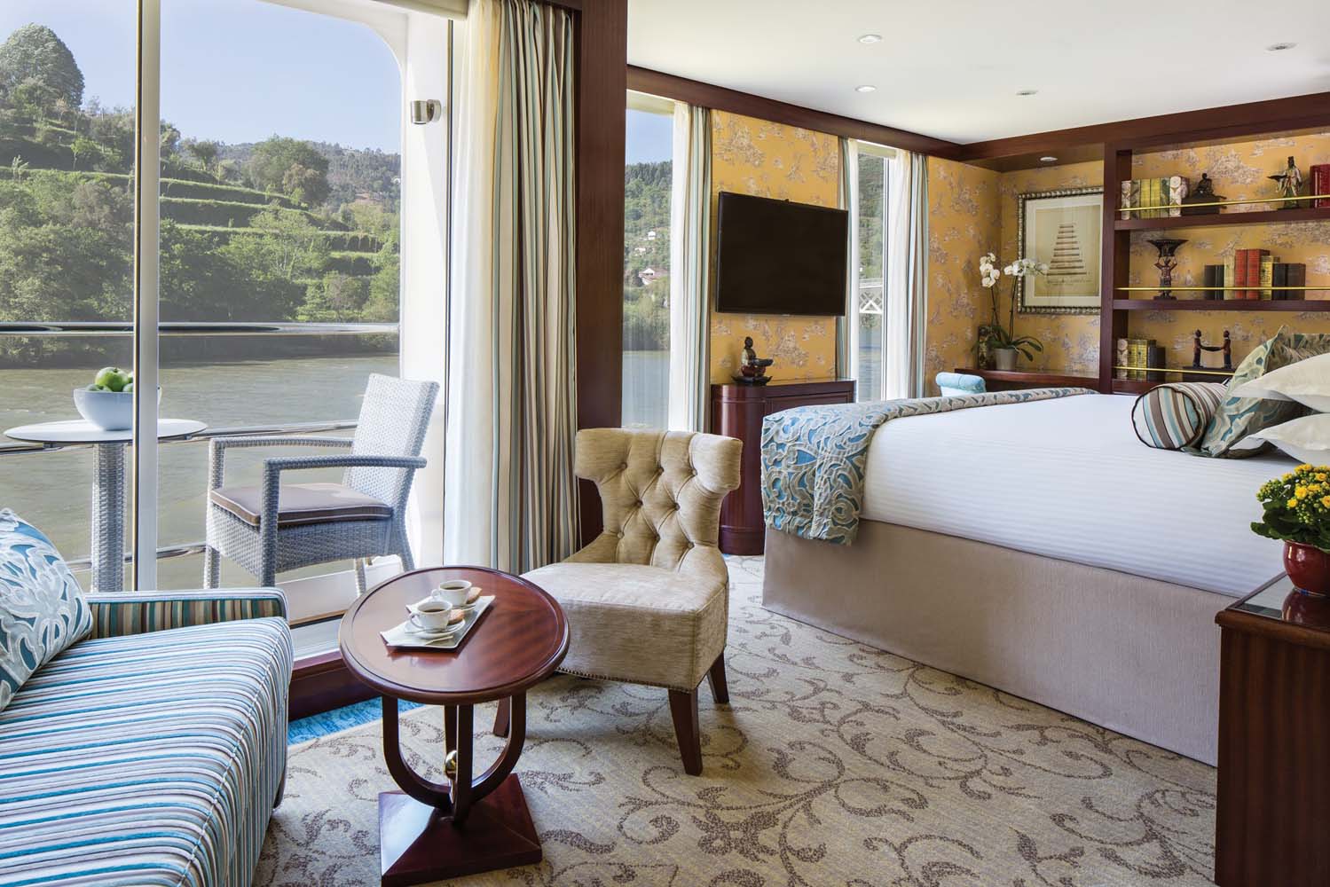 Category 1 staterooms are lavishly appointed river view rooms with full balconies. The height of luxury, they have hotel-style beds draped in fine linens, a vanity, built-in closets, hair dryer, safe, individual thermostat for air conditioning and heat, direct-dial telephone, flat-screen TV with satellite, bottled water, bathroom with Claus bath and body products, magnifying mirror, and plush waffle bathrobes.All Category 1 staterooms are uniquely decorated and have additional amenities and services, including: one-per-person complimentary in-suite well-being treatment; daily fruit and biscuit plate, and an elegant evening snack; bathroom towel warmers and heated mirrors; iPod dock; nespresso coffee machine and fine teas; fully stocked minibar; bottle of wine upon arrival; morning coffee and tea; full breakfast menu; shoe shine; free laundry service; and bathroom stocked with added comforts, such as Hermès bath products.
