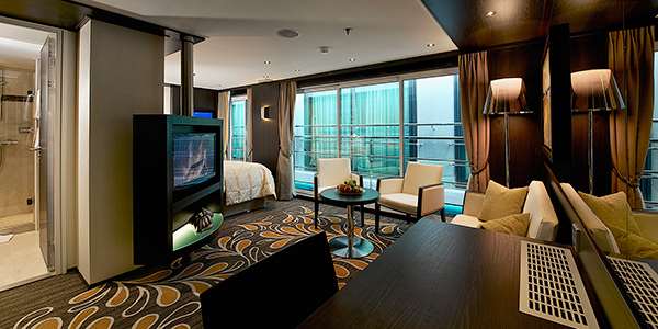 Located on Royal Deck & Sapphire Deck (Forward & AFT)Suite features include:Comfort Collection BedsEgyptian super-combed cotton linensSoft & firm pillowsChoice of bed configurationBedside tables with reading lampsL'Occitane bath productsEasy under-bed luggage storageAlarm clockDirect-dial telephoneWell-stocked minibarIn-room safeElegant, contemporary designMarble countertops in bathroomUSB Ports6-person sitting areaWriting desk and chairSofaLuxurious mattress toppersEuropean-style duvetsExtra blanketsNightly turn-down serviceHairdryerSpacious 3-door closets with shelves for ample storageFlatscreen satellite TV with English-speaking channels & over 100 free movie optionsMake-up mirrorBathrobes & slippersComplimentary bottled waterIndividual climate controlLarge mirror in bathroomComplimentary Wi-FiWall-to-Wall Panoramic Window with Open-Air BalconyFull shower with glass doorVanity and lighted makeup mirrorCoffee table