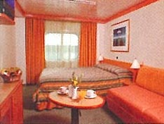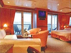 2 lower beds that can convert to queen size, whirlpool bath, shower and sitting area. All cabins include 24 hour service, satellite TV, air conditioning, phone, hair dryer, safe and mini bar.