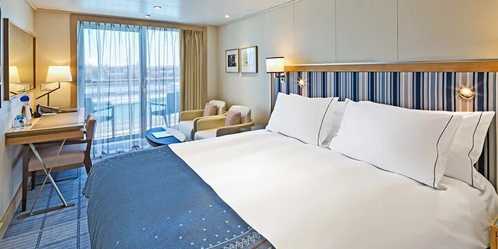 Stateroom size: 270 sq ft (includes private veranda) Ocean-view stateroom with floor-to-ceiling sliding glass door opening to full-size veranda Shore excursion reservations 60 days prior to departure. (Voyages embarking before May 31, 2024) Priority shore excursion reservations 100 days prior to departure (Voyages embarking on or after June 1, 2024) 11 AM Embarkation 3 PM stateroom access King-size Viking Explorer Bed (optional twin-bed configuration) with luxury linens & pillows Free Wi-Fi (connection speed may vary) 42" flat-screen TV featuring MSNBC, FOX News, National Geographic and more 110/220 volt outlets & USB ports Large private bathroom with spacious glass-enclosed shower, heated floor, anti-fog mirror & hair dryer Premium Freyja® toiletries Plush robes & slippers Direct-dial satellite phone & cell service Security safe Individual climate control Purified water refilled daily Mini-bar with soft drinks, water & snacks Stateroom steward & twice-daily housekeeping 24-hour room service Under-bed suitcase storage space Spacious drawers & closet with wooden hangers